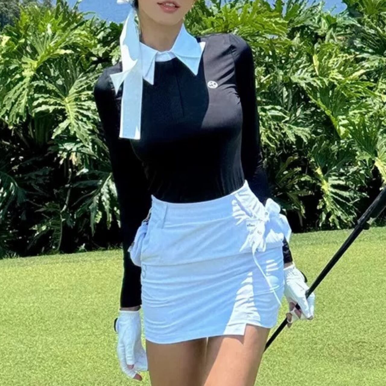 ボディラインに沿ったポロシャツ風のトップスはスタイルアップして見えます。